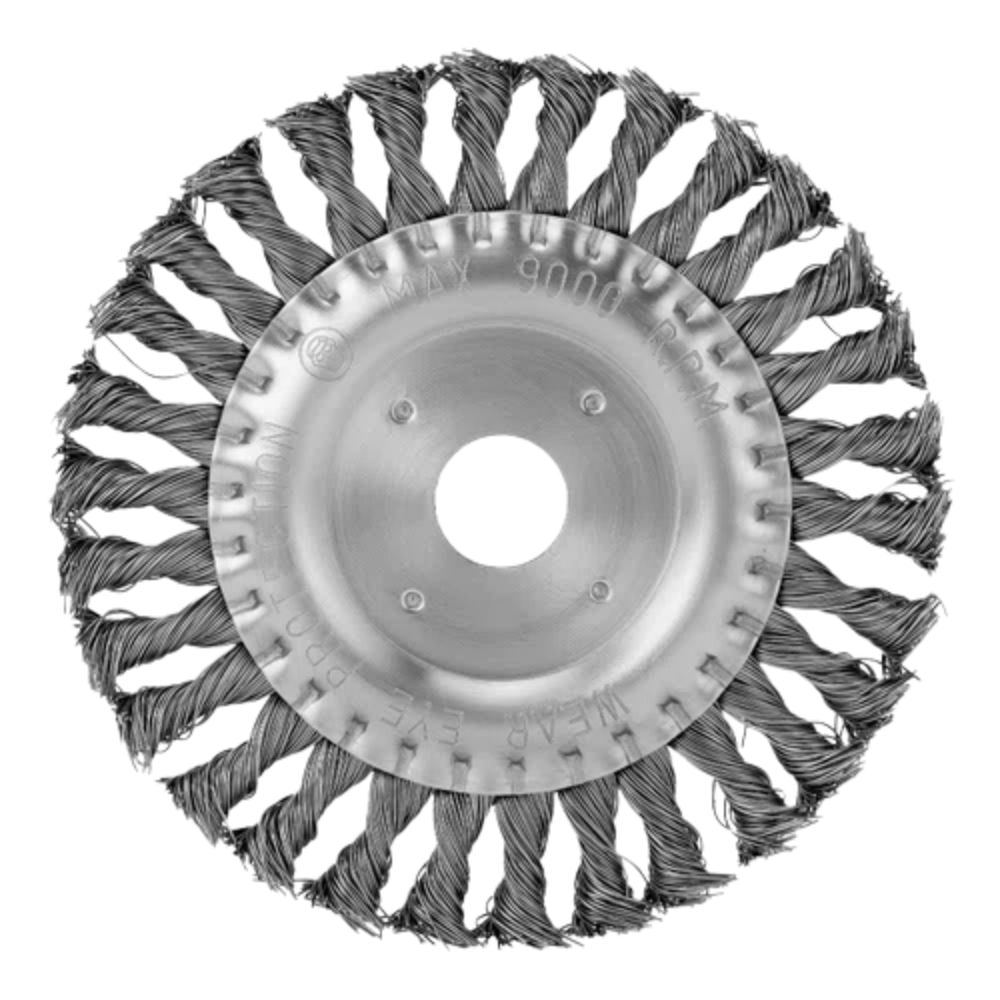 Com um diâmetro de 150 mm e um encaixe de 22,2 mm, esta escova robusta se acopla perfeitamente ao eixo de esmerilhadeiras angulares, operando a uma velocidade de rotação de até 9000 rpm.