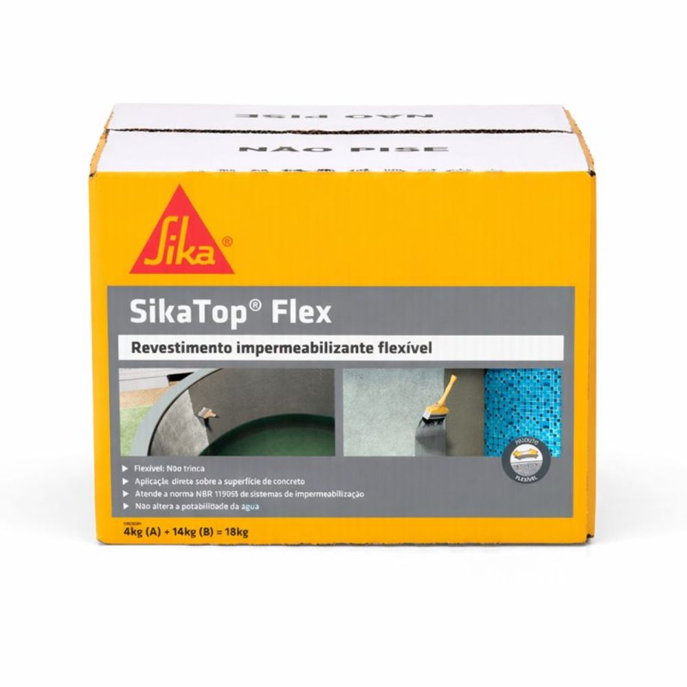 O SikaTop® Flex 18kg é um impermeabilizante bicomponente à base de cimento e resina acrílica, ideal para estruturas sujeitas a movimentação como caixas d'água, piscinas e áreas frias. Oferece alta flexibilidade, aderência e já vem com fibras sintéticas para evitar microfissuras.