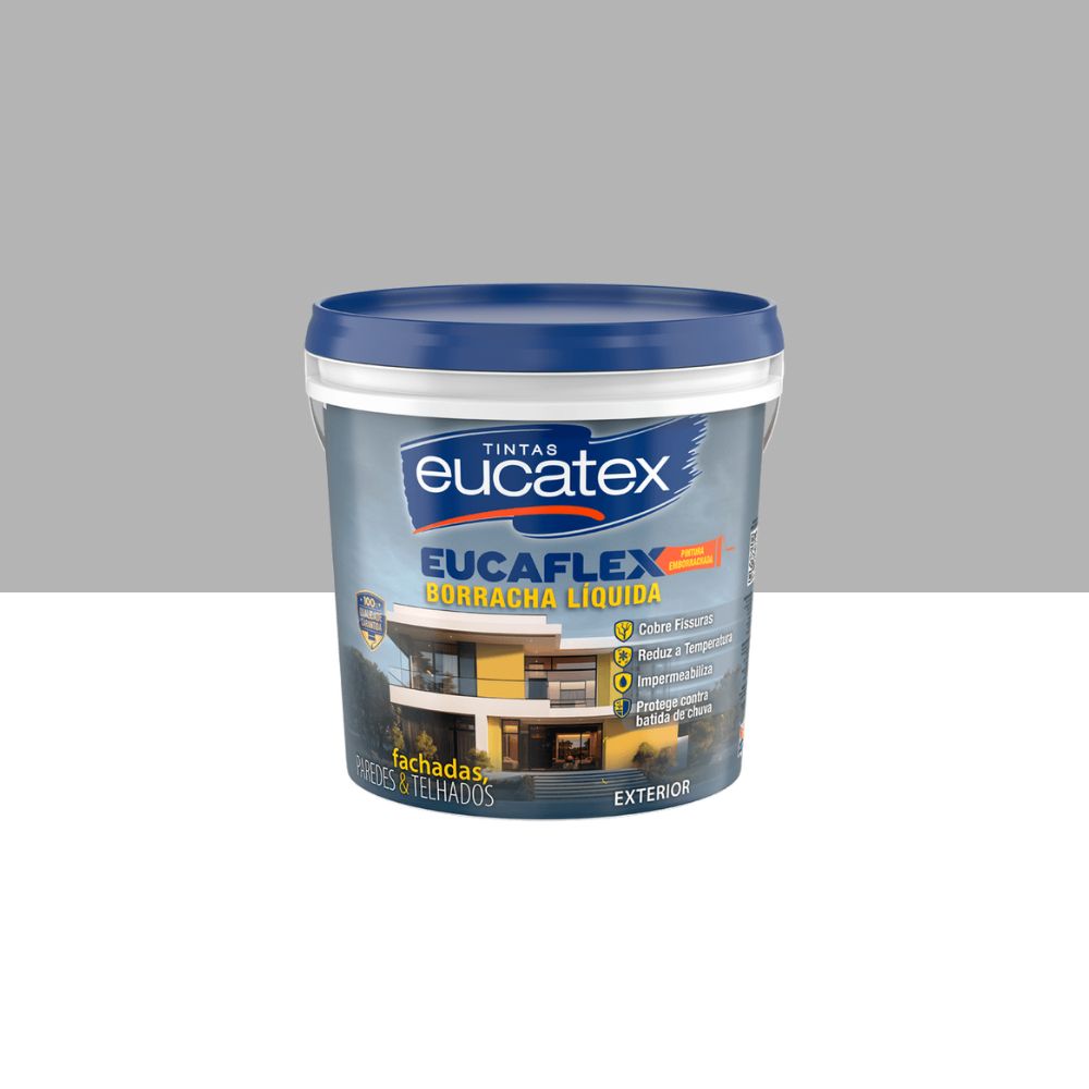 Eucaflex Borracha Líquida é um revestimento elastomérico de boa performance e tecnologia. Sua formulação atribui ao produto alta cobertura, bom rendimento, com 100% de elasticidade do filme e cobre fissuras de até 0,3 mm. Ideal para pintura em alvenaria, paredes, repinturas, telhados de fibrocimento e outros. Uso externo
